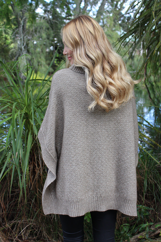 Generous square poncho in a textured knit with cowl neck - easy, relaxed style and warmth. Designed and produced in New Zealand by Lothlorian Knitwear for your comfort and warmth reflected in the extra length.