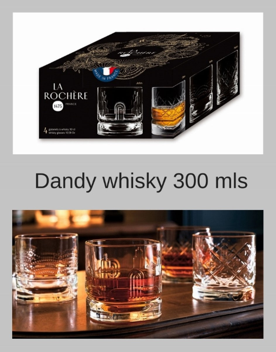 Dandy whisky glass size 90mm, 300ml; dishwasher safe.Sold in a box of 4 glasses